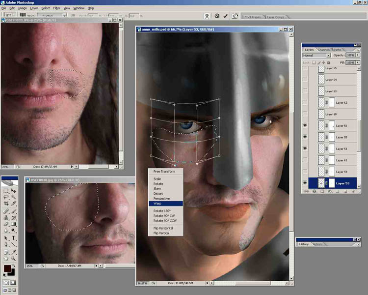 In this step the approach is very intuitive; we have to identify most useful image parts, trying out them by juxtaposing side by side and, when they are chosen, start to integrate the pieces between them, with a technical similar to matte painting. At the end of this process we have a face with photorealistic skin. Usually, to adapt photo pieces to the 3d poser base perspective, I use a very useful tool named “warp”. You can find it in photoshop since C2 version in levels transformations menu. It’s a deforming grid manageable by “handles”(like Bezier curves) or directly by modifying the shape of segments compounding the grid by picking over and dragging.