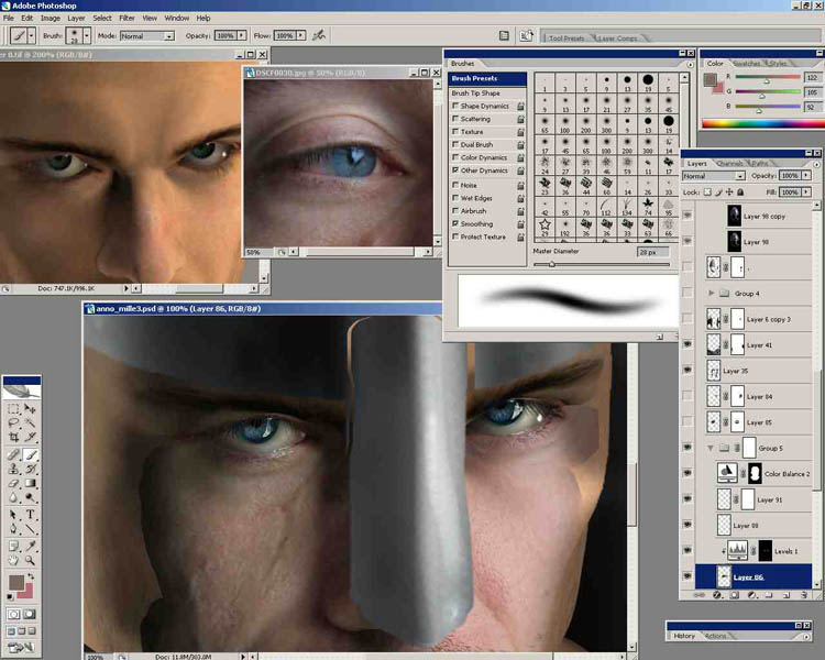When photographic base is done, it begins the painting stage. I started from the eyes because this was the part I was more worried about. They had to be a lot more realistic and expressive than those from 3d poser model. Thereby, whit patience and care, I added details, reflections, shadows, blurriness, till I became satisfied. For this kind of work I mainly use these instruments: brush tool, eye picker tool, smudge tool, blur tool, burn tool, dodge tool. I used this tools also to paint the scar under left eye.