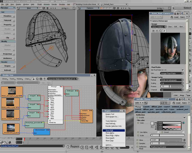 In this illustration the helm is a very important part. It fills all the image higher part and is the only element who describes the historical age we are treating. Therefore I knew it had to be fancy in details and in material look. It had to be perfectly integrate with the whole image and had to have a correct perspective. I decided to make it with softimage xsi because I was sure I could achieve all these goals in a better and faster way than with the use of a 2d technique. After the creation of the polygon mesh model we have to fix camera matching by using, as perspective reference, our “w.i.p.” illustration in rotoscope mode ( camera rotoscopy section ) Afterwards we’ll work on helm final look by fixing scene lights, environment reflections, material glossiness, textures, ambient occlusion (dirtmap) and bumpmap generator.