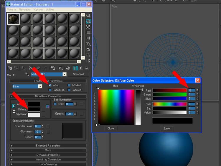 Once you have selected Standard, you will see your Material Editor slot default back to a gray material. Don’t worry. All you have to do is change the Diffuse color to black, following the same steps as earlier and select Wire under the Shader Basic Parameters.