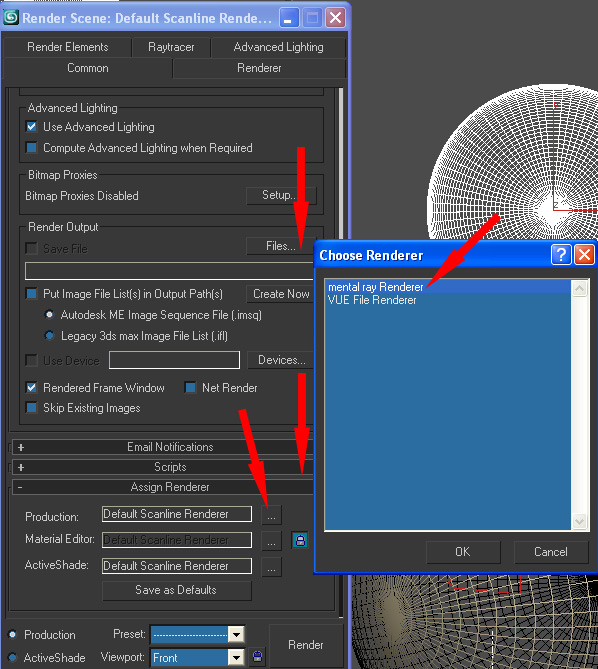 This will open the Render Scene: dialog box. Go under the Common tab, scroll down to the bottom and click on the box with the 3 small dots next to Production: Default Scanline Renderer. The Choose Renderer dialog box will appear. Select mentalray Renderer.