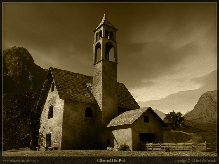 So where to find an inspiration for your projects? Well there is no recipe for that, if you want to start from somewhere I recommend the sites that have a lot of photographs, like PhotoSig or DPChallenge or Environment Textures. My idea came from one picture that I’ve found on one of those sites. It was a photography of one old church in mountains. The image made a special emotional touch to me, and there it was. After an hour of thinking I decided to go for something different than original picture. My decision was to made the image older, with sepia tone, to add some trees in it and to make a small grave in the back to invoke a feeling of sadness in viewers. So that’s it, I started to work on it…
