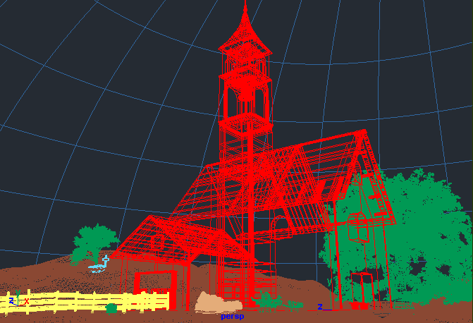 As you can see in the picture below the models in this scene are fairly simple. Don’t worry about the trees, they can be easily created using paint effects. 😉 As for the building and fence, I’ve used the polygonal modeling from start to end. Why did I used polygons …. well they are easy to manipulate, with only few steps you can cut, extrude or do some bollean operations on them and you can create the nice UV map for texture painting.