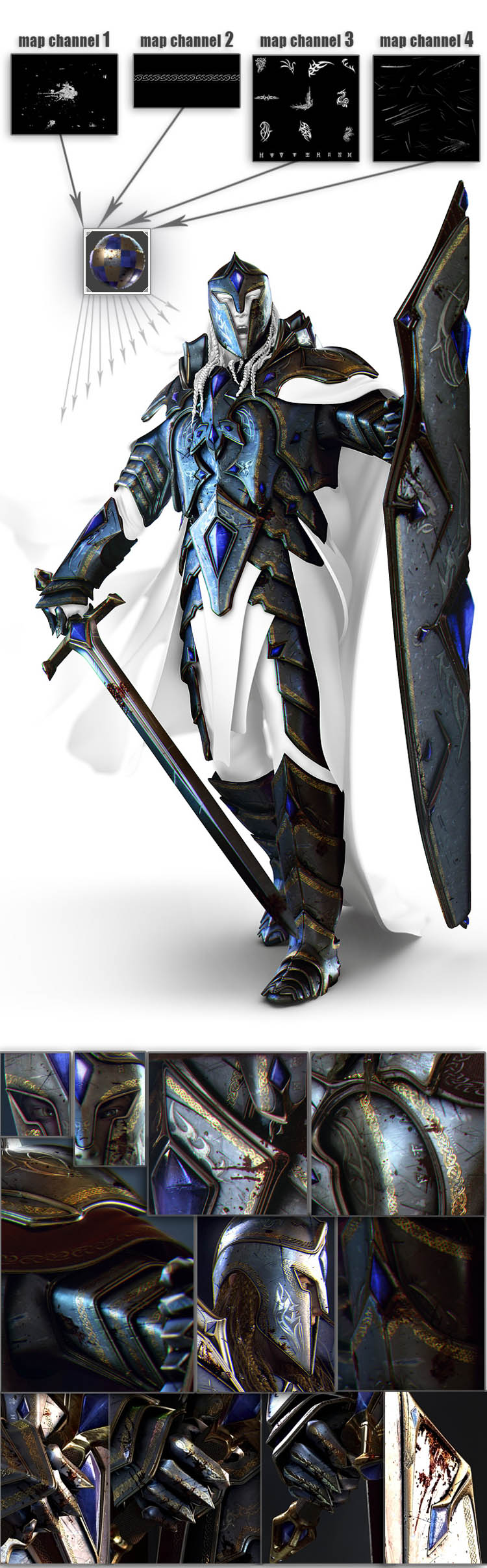 Over the years I’ve learned and developed my own solutions and methods for complex texturing. The blood knight is the second of several characters I’m making and since he’s the one who experiences the battle up close and personal more than the others, I’ve decided that with him I will try to push my methods to add many details such as dirt, scratches, stains, blood, decorations etc’ much further than before in a method I like to call "multi-channel texturing". My main focus on this character was the texturing / shading and in this tutorial I will share the process, considerations and a few other tips.