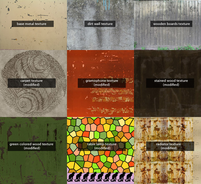 The main textures (for example the wall and the floor) are in a bit higher resolution (about 120 dpi and 3000 x 3000 size in pixels), just to make sure the quality doesn’t decrease, when rendering a larger resolution. This also helps to keep all the small details in your bitmaps, for example the small differences in the bump maps which can make quite an impact on the final result.