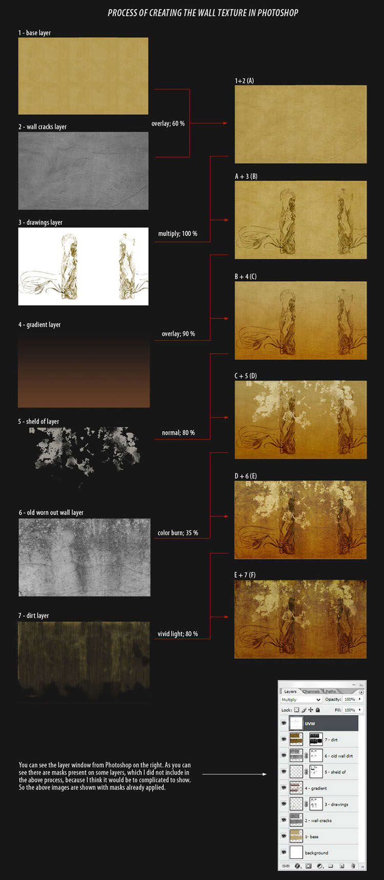 The wall texture was a little easier and I made it a lot faster, although it consists of several layers and masks in PS. The scheme below tries to explain the basic steps of the process of creating it in Photoshop.