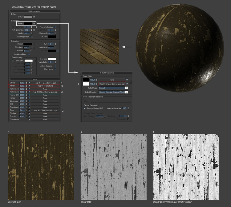 The trick was to get the part of the floor where the plaster is a lot more reflective than the washed out part. To achieve that effect, I used the reflection map and also the reflection glossines map. The reflection or specular map is used to define the area where the material reflects more and where it reflects less or doesn’t reflect at all. The reflection glossines map defines the areas where the reflection is more or less glossy and adds a lot to the realism. Both mentioned maps use the same color range as the bump map, from black to white. By the specular map, white means 100 % reflective and black means no reflection at all. Similar goes for the reflection glossines map, but for the glossiness of the reflection of course. You may notice that at the wooden floor material the specular and reflection map are the same – this is because I wanted the parts that reflect less to also have less glossy reflections.