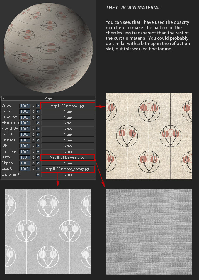 The curtains material was made with the help of the opacity map. I wanted some patterns to be less transparent, so I made a b/w map where the cherries pattern is almost white, which means that it has almost no transparency (black means 100 % transparent), and the other part of the cloth is medium gray.