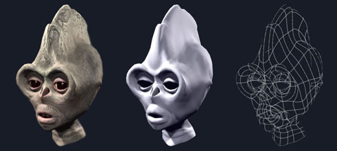 This is another character I made with the same method in Max3.1. The texture is more complicated, so I used lots of layers in multitexture channels. You can see two of these textures below, one of which is Diffuse and the other a Bump map. Above you can see the model in 3 phases. The right shows the patch net, the middle is without material and textures and the one on the left is the completed model.
