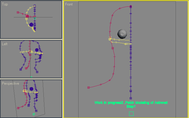Here you can see the head of the astronaut which was done in Max 3.1 and of course one has to have experience in 2D & 3D spline modeling and be familiar with the Vertex Bezier and Corner and where to use them, for example. One of the important points here is that the cells which make up a net created from the spline design should be at least a triangle and in the perfect state a square, and this process should be completed by assigning a “Surface”-modifier, the spline is then replaced by a skin, but if the spline model contains more sides in some parts the result won’t come out at all. The pictures can show this process. Also you can download the Max file.
