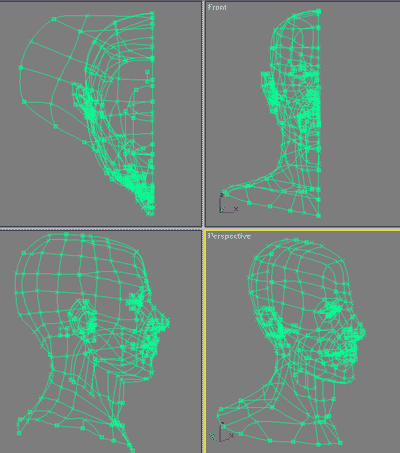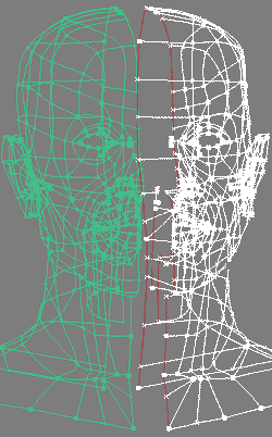 Now in this stage the drawing of the model is completed. All the splines should be attached but better not welded because the result might be different, then a mirror is cloned from it (image on the left). The selected red spline is deleted. By using vertex snap the two headhalves come close so that the vertices of their two edges meet eachother and overlap. Again all the splines should be attached but better not welded.