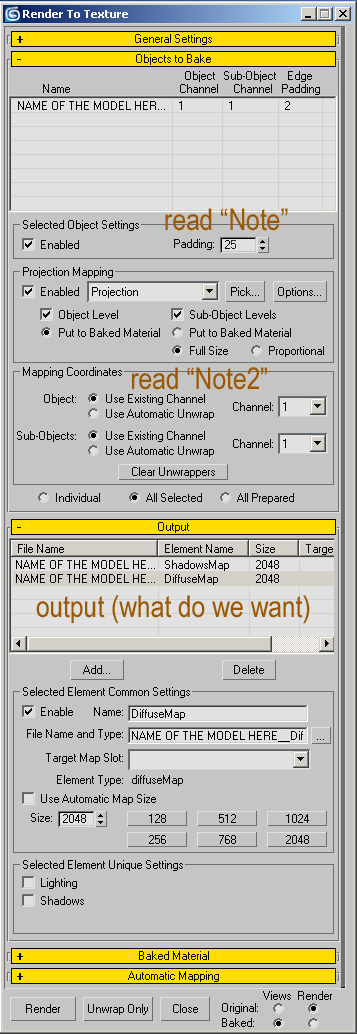 After this I’d Select the untextured one and use Render to Texture tool to project textures from the model with many textures into the model with one tight UVW map. This way You don’t need to make anything from scrath or redo most of UVWs map because of changes in the model. How I usually set up Render To Texture: