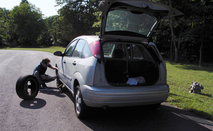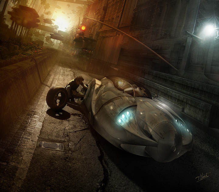 The work on „Blowout at Exit 16A“ (created specially for the book Carnivora) started with a purely computer generated image featuring Till Nowak‘s Woojet concept car and the city of his short film „Delivery“. Then Leslie Barany suggested the tire changing idea and contributed his photo of artist Eli Livingston handling a real life situation after a blowout at an existing interstate exit 16Ain New Jersey, the origin of the title. Besides endless painting, layering, color correcting and masking there are several hotographic elements that played an important role in the final image, as you can see on this page..