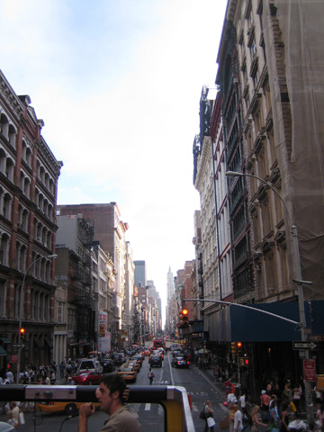 A photo taken from a New York tourist bus provided buildings and traffic.