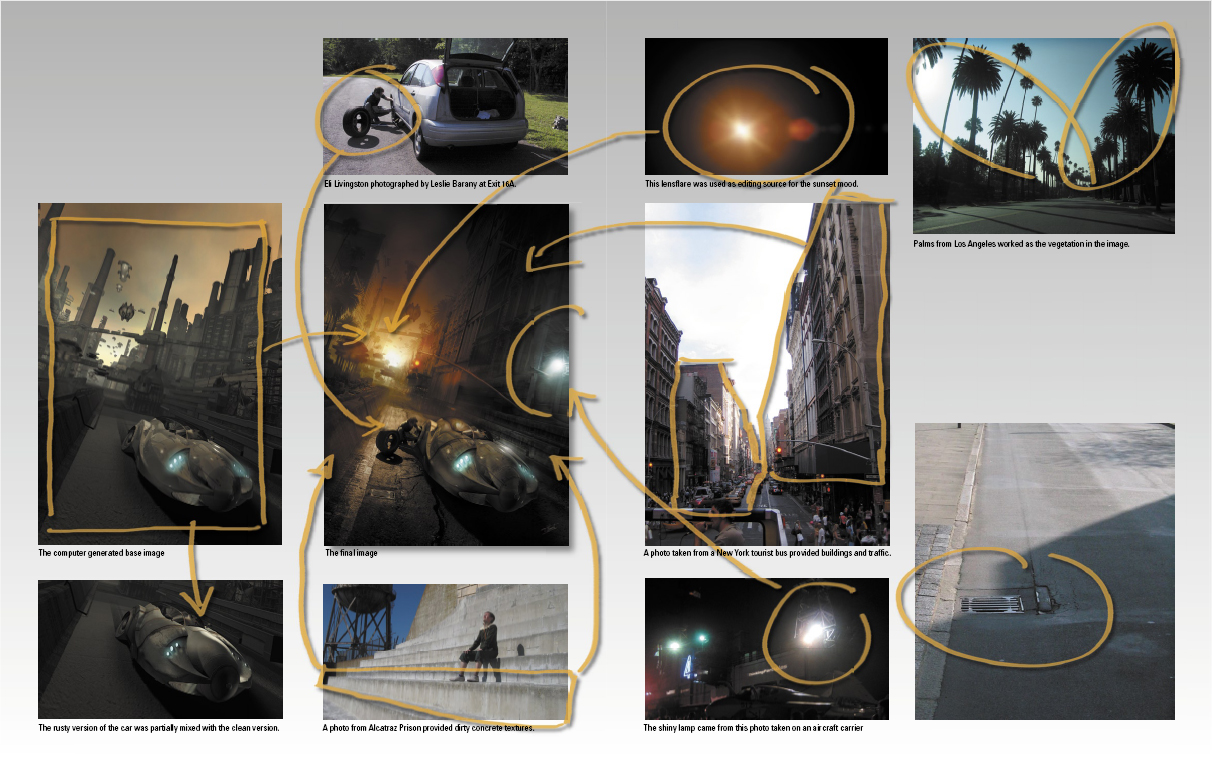 Most of the work consisted of painting fi ne masks and fi nding solutions to match the perspective, light direction, refl ections, shadows and color tone of all elements. The mix of vegetation with skyskrapers is meant as a reference to the shortfi lm “Delivery”. The original format of the image is 2500×3500 pixel and about 50 photoshop layers were used, which is not much for a full week of work. Due to the extreme color distortions the whole editing happened in 16 Bit.