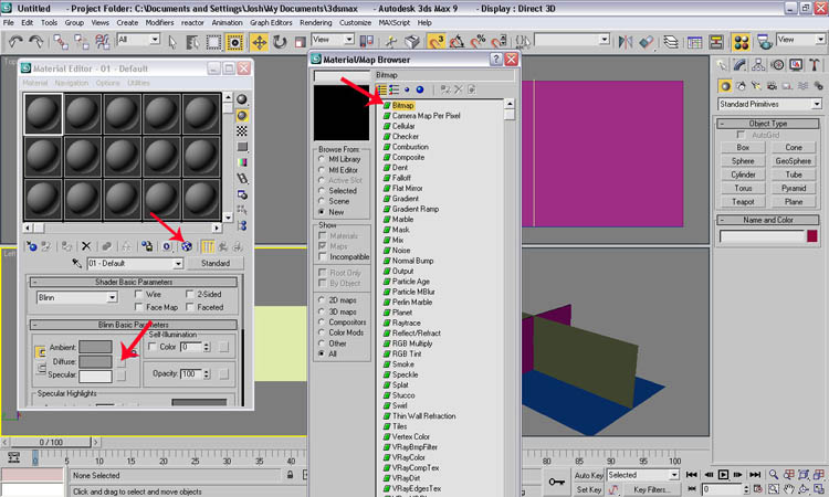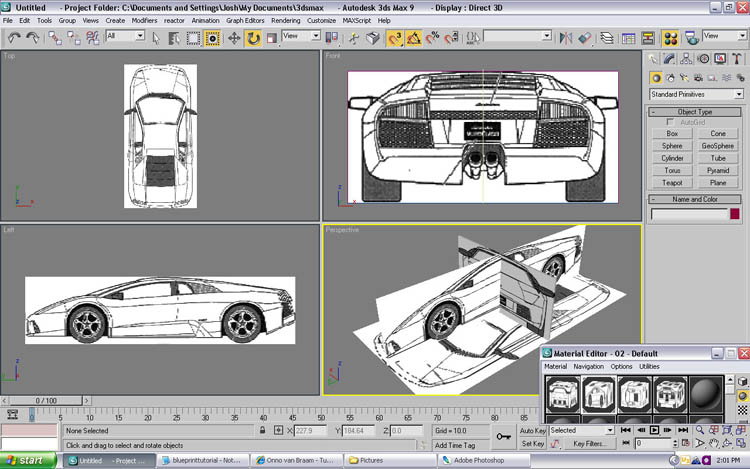 When the Material Editor comes up, select any empty slot, and then select the Show Map in Viewport button; otherwise your blueprint images will not appear in the viewport, and then find the diffuse color slot. Select the box next to it, and then select Bitmap from the dialog box that pops up. From there search and find your