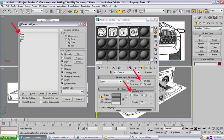 One more thing that you might notice is if the blueprints appear a little dark or hard to see, simply go into your Material Editor and under the Blinn Basic Parameters menu, turn the Self-Illumination up to 100 or any other desirable number for you. Also, check the box beside 2-sided. That will make it to when you are rotating your viewport, you will be able to see the blueprint no matter which angle you are at.