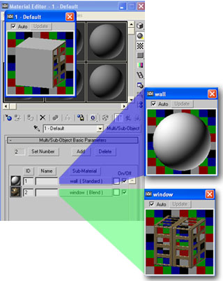 1. Create a multi-subobject material which material ID 1 = wall and material ID 2 = window. You can use an opacity map or blend material for this material.