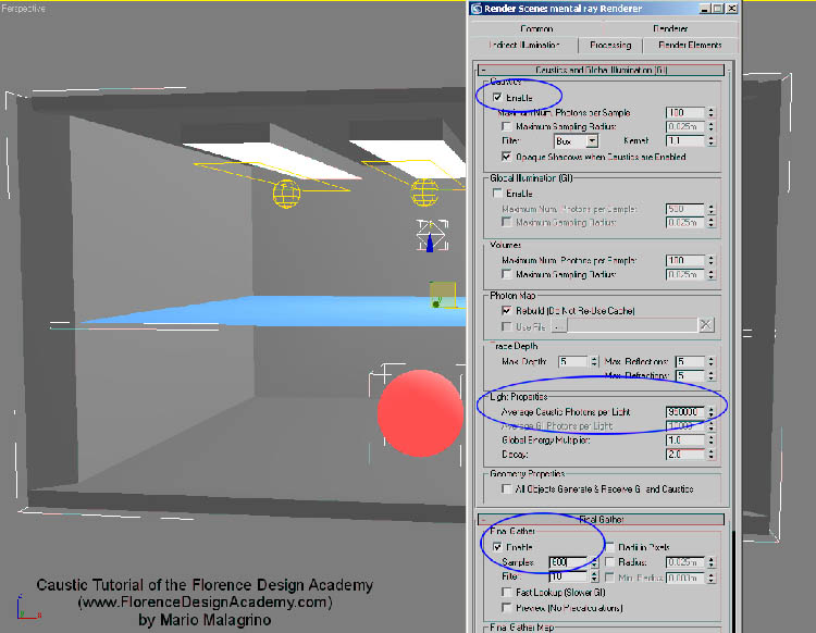 Go on the “Mental Ray” panel and check “GENERATE CAUSTICS”.This is necessary in order to have a caustic effect on the objects. Now we must go to the “INDIRECT ILLUMINATION” panel ( panel for rendering – image”4″).and enable “CAUSTICS”. To improve the quality of the caustics ( better/clearer shapes ) you must go to “LIGHT Properties” and put a VERY high number in “AVERAGE CAUSTIC PHOTONS PER LIGHT”.I put a bit less than one million. For test renderings it is enough to put 10.000. The higher the number, the better will be the effect. Of course it will take much more time to render all the scene. You can put very high numbers in multiplier (MR.Area Omni) to create a very bright caustic effect. If you change the light color of the MR.Area Omni you will change the color of the caustics ( blue omni color = blue caustics). To have a blue color of the illumination under water the water material should have a blue color in diffuse and transparency like on image “7”.