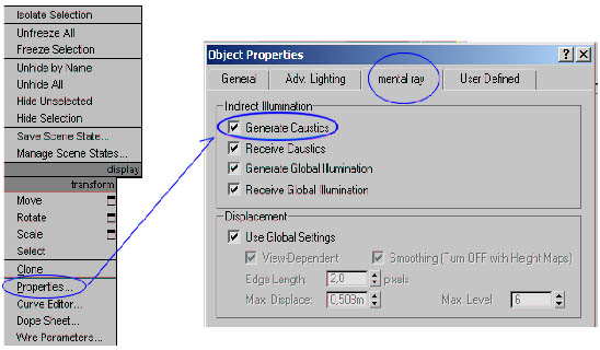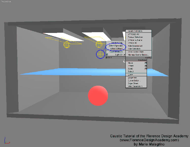 After this step this MR.Area Omni will NOT anymore affect the illumination of the room. We will use that MR.Area Omni ONLY to create the caustic effects. In this way we have much more control of the caustic position ,color and brightness. Disable shadows in the MR.Area Omni. Now select the MR.Area Omni and all other objects except the lights that you have created for illumination ( Free area lights). Make a right mouse button click on all the selection and select properties like on image “6”.