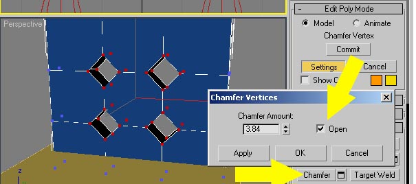 9.Add EDIT POLY modifier to the back of the chair. Go to VERTEX sub-object level and select the MIDDLE vertices in FRONT viewport. Then, with vertices selected choose CHAMFER tool (click little rectangle symbol to the right of the word chamfer to bring up the dialogue box). Tick OPEN and slide up the chamfer value until you get desired result