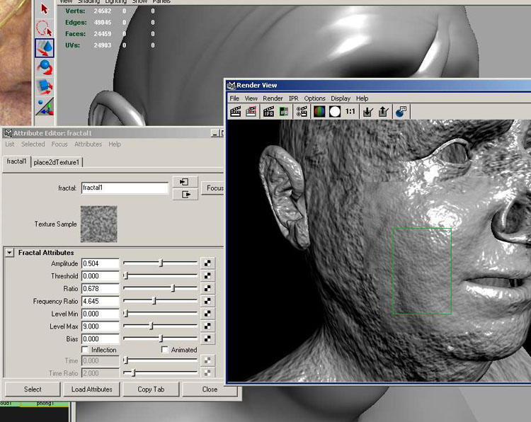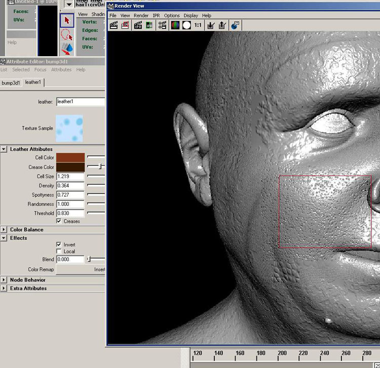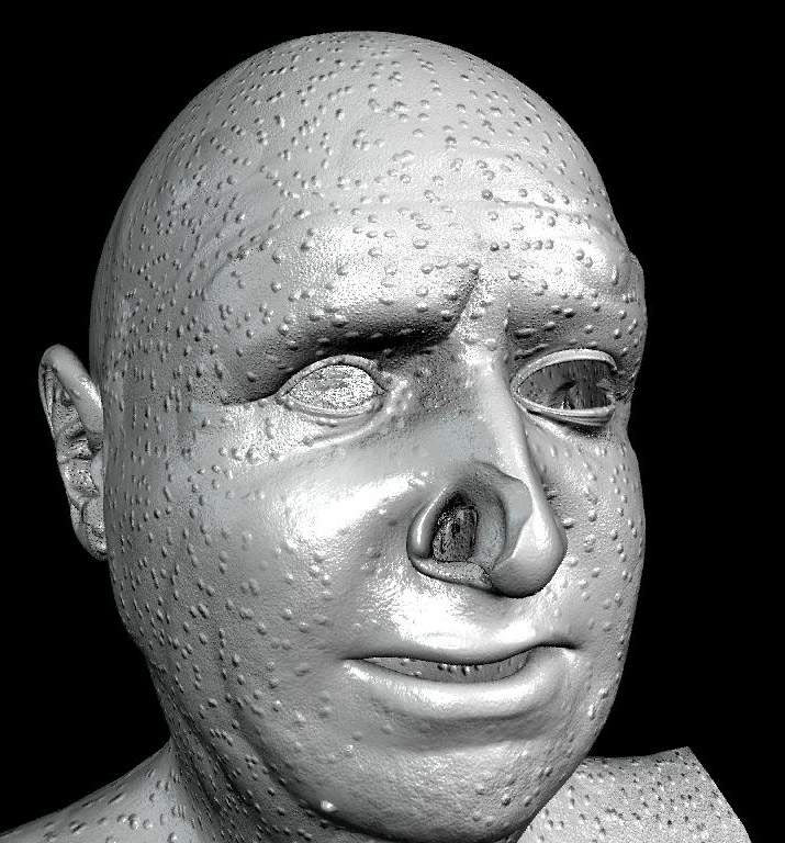 Now we need to be making lots of test renders while we work on the bump map, there’s only really a few areas of this spot map that I want to keep. I like the big lump that’s above his left eye, i’ll probably try and keep that in.