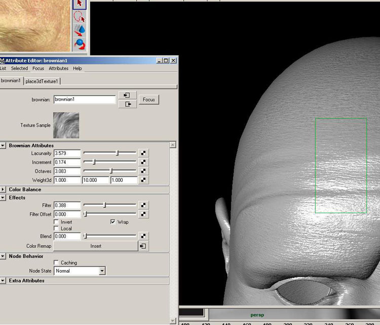 Next i’ve used a brownian texture to make the very fine wrinkles that you might see on the forehead or around the neck. Converted to file texture again.