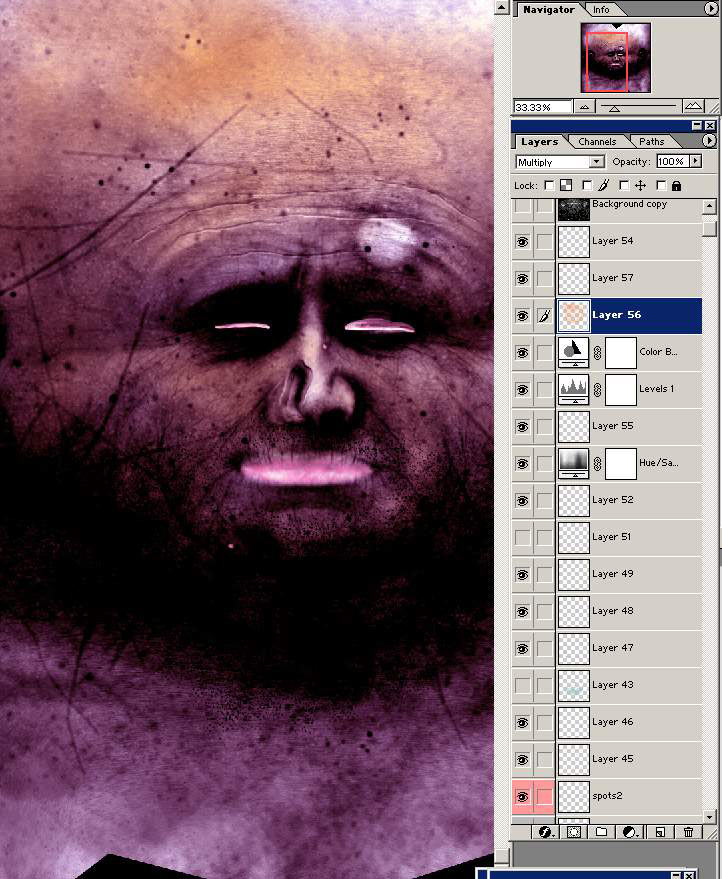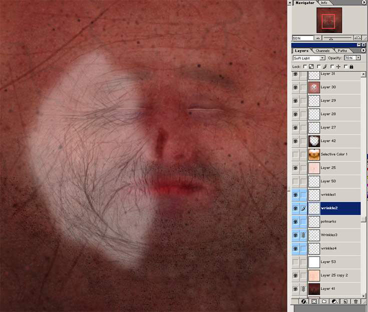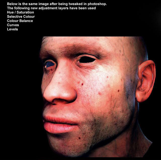 Now you can use some of the bump details on the colour to darken where the wrinkles are, sometimes it can look better if you paint over them with a more reddish colour where the wrinkles are (like the scars) but that takes time, but can look a little better.