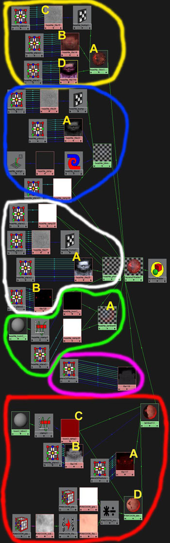 Now it may be a bit hard to find but circled in PINK is a transparency map this is used to blend with the bottom layer some areas i want to keep dark as possible other areas i’m happy for the reddish underneath to blend though. Next up circled in GREEN is a ramp based shade trying to fake some translucence in to skin once, again taken from Dr Stahlberg’s skin shader reading his great tut will tell you about it.