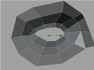 Now where the red spot is I have deleted the face, and where the green line is I have extruded a edge. This is because I want the polygons to follow the contours of the face and I want that line of polygons to run down the nose. Look at the picture of the man at the top of the page and your see the area I just made.