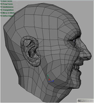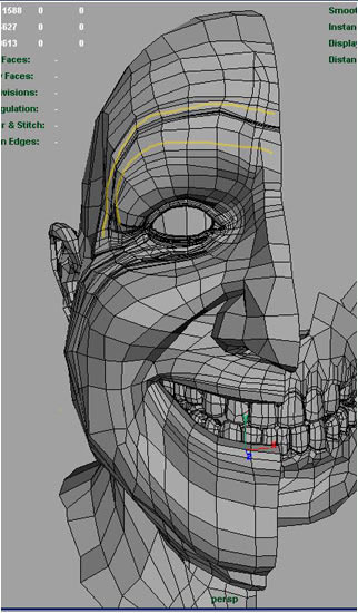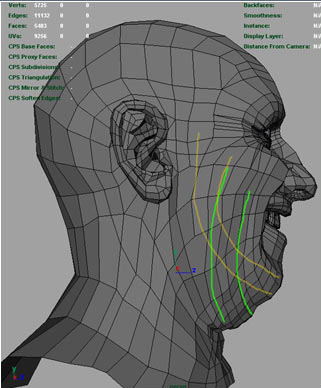 Now looking from the side. Marked green I decided to change the flow of the lines down the cheek and chin area, marked in yellow are where the old lines use use to follow.