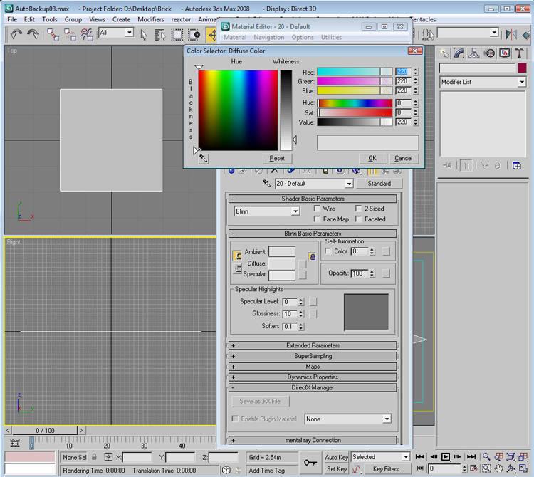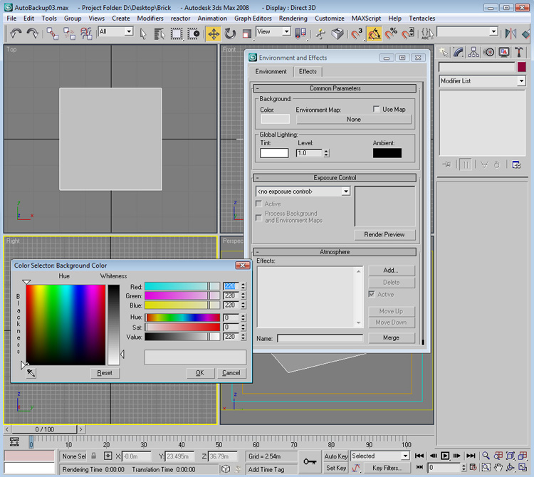1) Create a large plane in the top viewport and assign a standard white material to it. My plane was 100m by 100m large. I have also chosen to use an off white/grey colour instead of white but that is down to personal preference.
