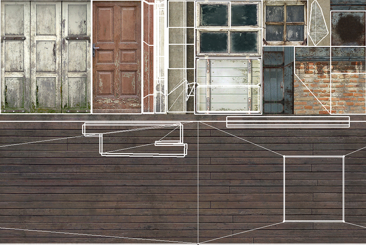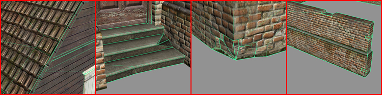 After the entire building is mapped, there is still room for adding some details like crooked or broken off roof tiles, missing wooden planks or bricks, a broken staircase, etc. This is done now as it’s easier to cut the geometry using the texture details than vice-versa.