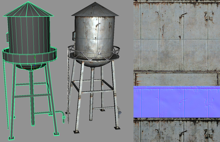 The water tower has been done using the same methods. I tried reusing the texture as much as possible to increase the resolution. The same texture area has been used for the roof and bottom of the reservoir. The lower tileable area of the texture is for the pillars of the tower as well as the ladder and handrails. Besides this texture, I’ve used the 256×256 alpha texture for the framework.