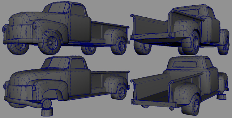 The top part of the previous image shows the initial pristine model of the truck. The bottom images show the desired abandoned model that will be used in our scene. The advantage of building a pristine version of the object first is that we’ll have two separate models that can be used in the game.