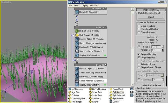 8. Add a Split Amount operator to the event 01 below the birth operator. Create a connection from the Split Amount to the event02. In Event02 select the shape instance and select grass2. Now u can see how much the scene as changed. Cool isn’t it. U can even copy the Event 02 and create another Event 03 and add split amount to Event 02 and connect the Split Amount to Event03 and select another grass3 as object instance.