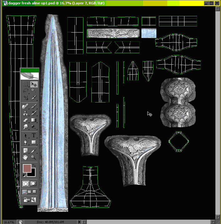 Open the same uv template in photoshop that you applied to your mesh in max At this point you can increase the size of the template and re apply it to your mesh to max as I have.