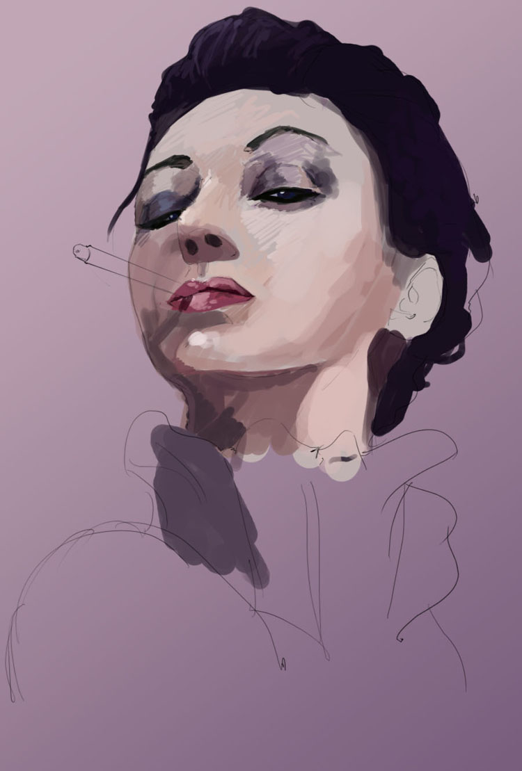 Now for portraits, I always do the same thing for my backgrounds. I use the gradient tool, which can be found in the toolbar and I just pick two colors and lay it flat on the background. For her, again wit the retro style, I just took too chalky pink/purple colors and used that as my background. Very simple. As we move on to the figures colors I always start off with the skin underlay color, which is just the basic flat skin color i’m going to go with. Then I go and paint in her hair, blacks, a few purples and so forth. I’m very OCD about not having something colored in; I kind of cooled down with not starting the shirt in. After I lay my solid colors down (Black for hair, Pearly Pink for skin, and so forth), I then start to paint over that with highlights and shadow differences. Just trying to block in my colors, especially the eyes which I always start on right after. I decided to give her some heavy eyeliner around the eyes so it’ll give her a more mysterious look. I’ve also gone and laid down some brighter colors on her lips, giving what will be my starting point for the highlighting there. Also remember to color the under shadow of her jaw as well.