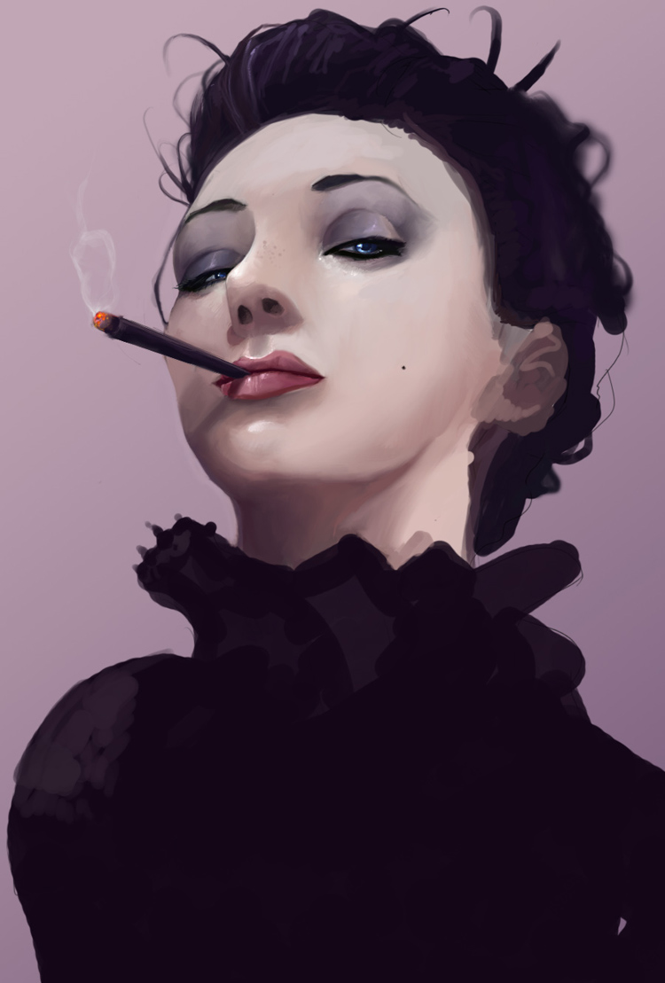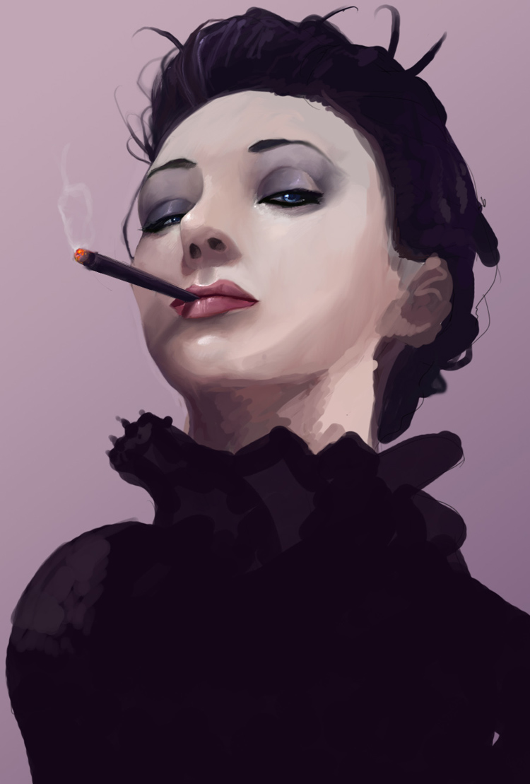 As said in the title, I’ve taken out the cigarette and started to refine some of the soft spots on her face. First off, was where the shadow of the cigarette was on her cheek, I have now over-painted the cheek with a soft pink/pearl color, starting to overall blend all the additional colors together. Once I have somewhat of an ongoing color scheme to the side of her face, I then blur it in with the Blur tool, not too rough, but just soft enough to get a smooth touch to it.