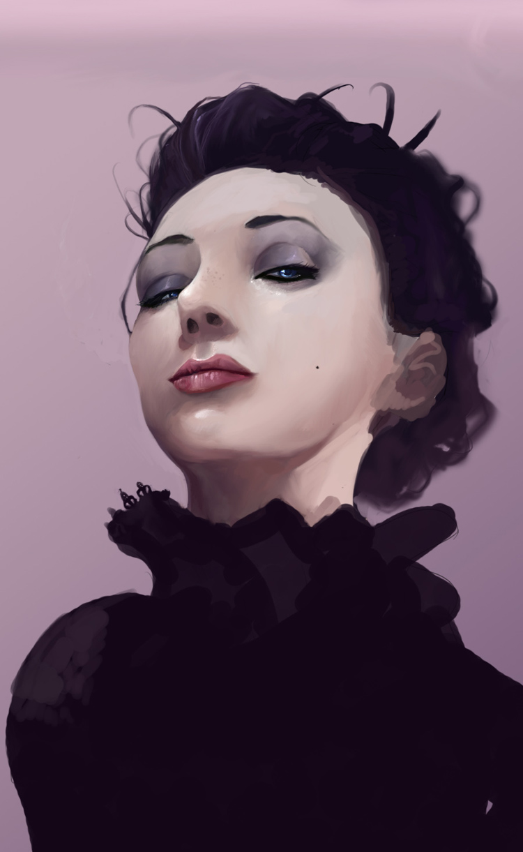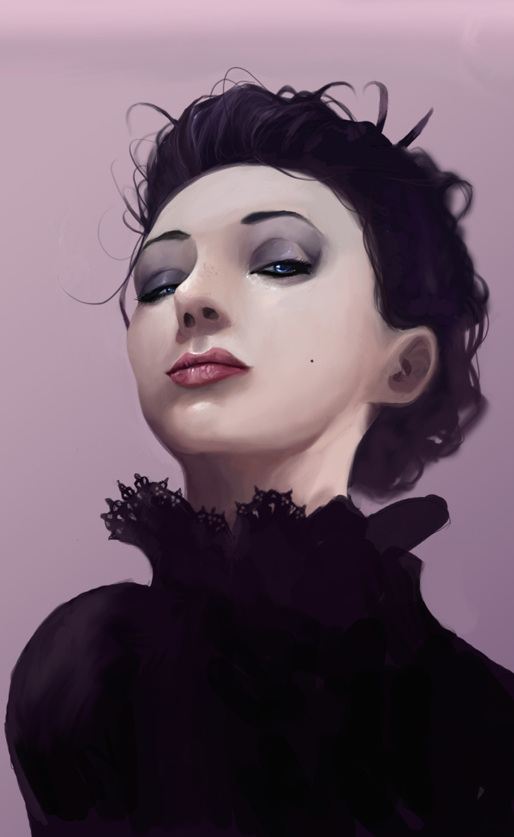 Tiny details, at least to me, really bring a picture to life. Whether it’s a tiny freckle, an earring, or whatever else comes to mind it can change a picture in a blink. Even a tiny strand of hair across her forehead makes her innocent, a raised eyebrow although makes her more mysterious. I start to detail the outfit all well, adding a nice fringe to the edges of the turtle neck. How I did this, was with a hard brush, but set to pressure. I first dabbled in the same color as the background to get the little embroidered fringes. Then I use a size 3 hard brush, still set to pressure, but 80% Opacity and put in the little tiny holes here and there. In the other image, I added some earrings to her left ear, shaped out her arms and body.