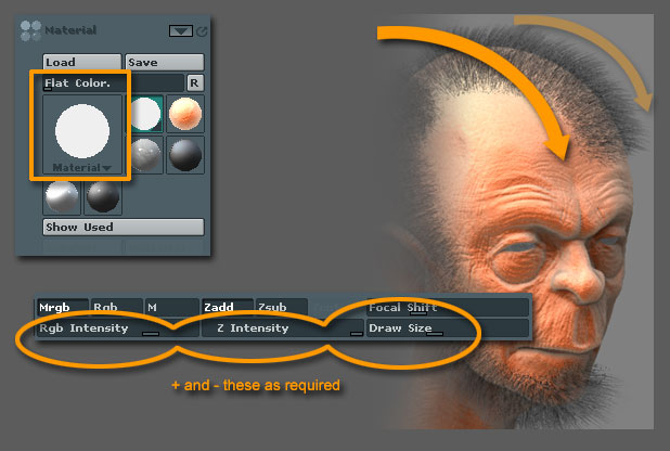 Then lower the RGB INTENSITY and the Z INTENSITY a little: experiment to achieve the desired effect. Vary the DRAW size to lengthen the strands as needed. Small DRAW size = short hair. All sorts of effects can be achieved with just these three before we even start to edit the FIBER BRUSH settings. If you are using a graphic tablet you will see that the FIBER brush is pressure sensitive, more pressure, more hair.
