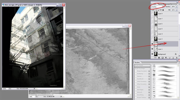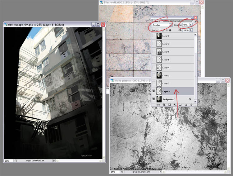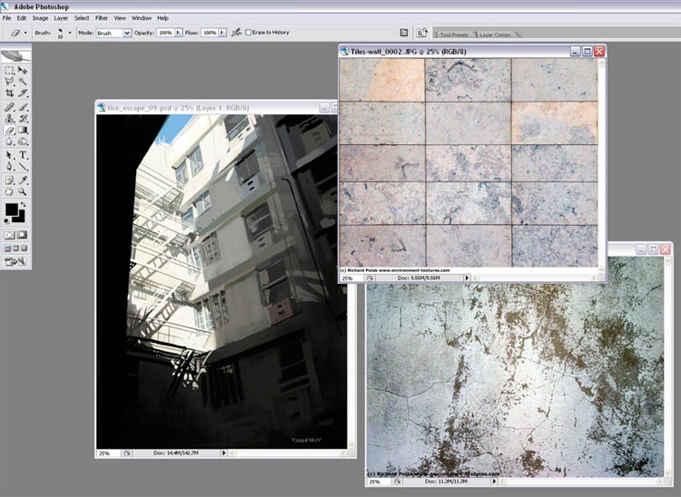 For the final stages I add in the lower railing on the fire escape as well as adding in the windows on the shadow side. I also fixed some errors on the top railing of the fire escape. One thing that people run into a lot of times is that they feel like their illustration just feels too “digital.” This can especially happen if you are just using normal round brushes and not any custom textured brushes. One way to add some texture to your painting is by taking pictures and overlaying them on top of your illustration.