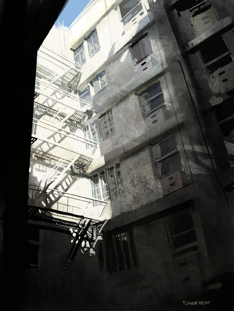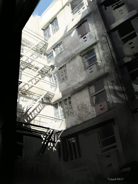 Now I am just darkening the areas under the ledges and adding in some more texture overlays. One thing to remember about using texture overlays is that it is never the end result, but just the beginning. You will probably want to paint more on top of your texture layers in order to better integrate it into your painting so that it doesn’t look so alien.