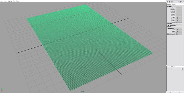 Click in the channel box on your plane in the input channel ( Inputs ). We need to set the Subdivisions width and height to a higher rate. We will have a well smoothed terrain. I set it here on 200. You can set it higher, but think about your computer-speed. Forming the terrain will take a few seconds!
