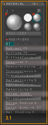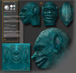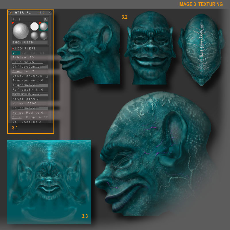 Before beginning a big Zbrush project usually have an idea of the type of materials that I am going to use. For skin/flesh/scales I usually use one simple material but then make several copies of it that I change just a little e.g. add more specularity. If materials have the same basic properties with only minor changes, it prevents the sharp lines from appearing where two dissimilar materials meet.For the skin on this model I wanted to use a basic material that used colour bump to add detail where ever I used a lighter colour. The settings I used can be seen in IMAGE 3 (3.1). This was the base material and from this I made 3 more copies, One with more specularity (2.3), one with more colour bump (2.1) and one with less noise radius and a positive colour bump (2.4)IMAGE 2.