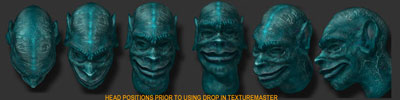 I use the same sort of sequence for texturing a head time and time again. I usually start by `dropping` (TM DROP or Keyboard G) the head face on then add some details with a similar colour to the base colour but a lighter shade. I usually use a `dotty` alpha brush or make a custom one to give a skin like effect. I then `pick` it up (TM PICK or Keyboard G again) and roll it back 45 degrees and repeat the above but use a dark tone of the same colour for under the lips and eyebrows. Pick again and roll it forward and use a lighter tone for the top of the nose, eyebrows and lips.