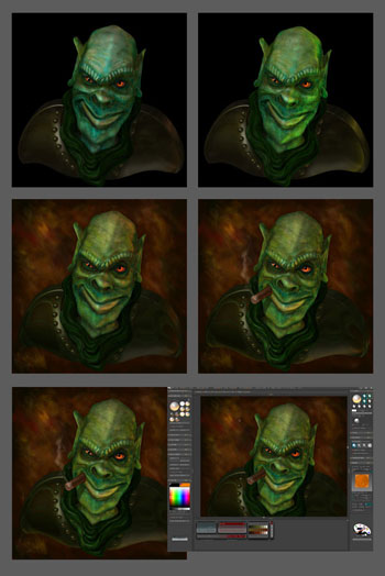 When you have done enough work on the head-texture move onto setting the head into an image. Using the Gyro, position and size a copy then snapshot a copy into a new document window that you have preset to the size you require (I used 2000×2000 for this project).I made several different versions of the `Smokin Orc` Texture and for the final image I settled on a more Greenish colour for the creature. I chose to put the head on some padded shoulders with a creased scarf. I used four layers as follows: