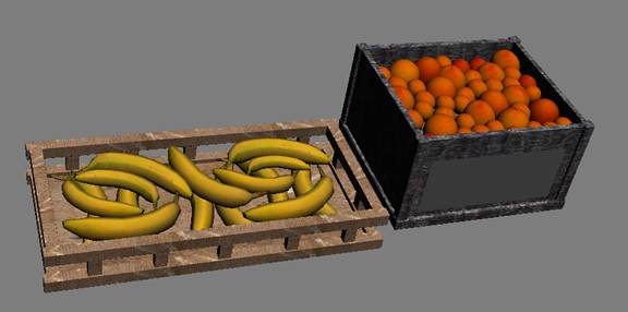 For the fruit I used simple shapes like spheres and cylinders and modified them with the Edit Poly modifer. I scaled two or three pieces of fruit and then instanced them in the crates to give more variation.