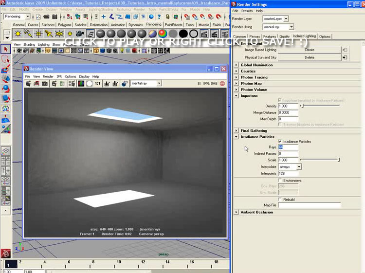 Irradiance Particles in mental ray for Maya 2009 In this video, from “Introduction to Rendering with mental ray in Autodesk Maya 2009”, we will continue to become familiar with the new Irradiance Particles feature from the latest version of mental ray. Learn how to start working with Irradiance Particles and lower your render times while balancing out the render quality of your image using custom techniques and settings.