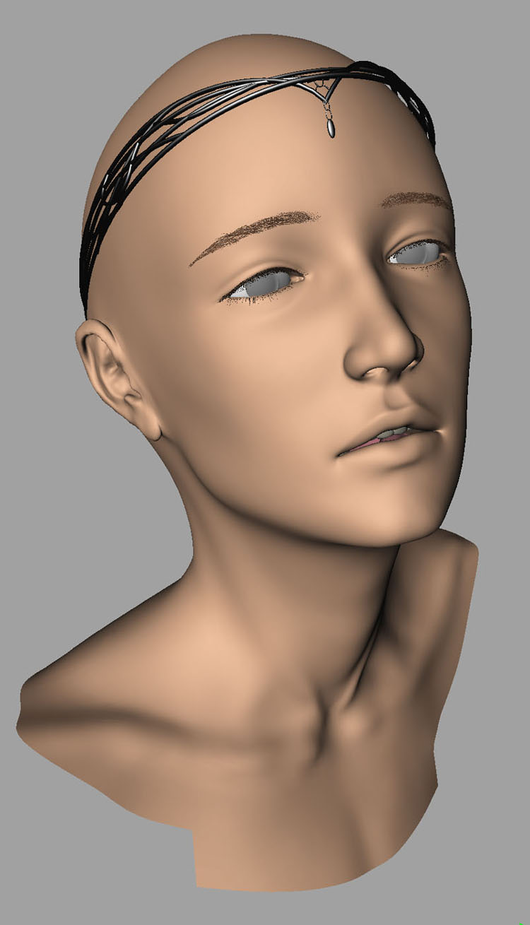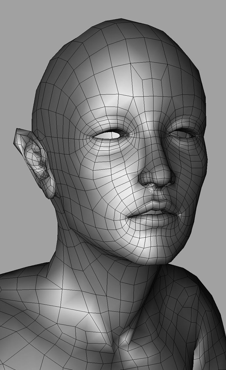Now,It’s the low-res modeling process.The character was modeled in maya.First I modeled a standard human body and spent much time on his topology structure.In this stage,i didn’t use any reference pictures,just letting her look like a normal person,then teeth,eyes and hair.The eyes are the two-layer models,one layer was used to catch the specular high light and reflectivity,the other one was used to place the color textures.At the beginning i used NUBRS patches to make the hair’s initial style.After all the elements were finished,i started to adjust her face characteristics,at this time,i made use of some reference pics,of course includes the original oil painting.I didn’t want my role looking too much desperate and painful.These are the wireframes of the character’s head,you especially need to care of the places which were marked red threads